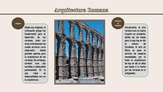 El documento describe la arquitectura romana, sus orígenes y características. Explica que los romanos se inspiraron en las civilizaciones griegas y otras, pero desarrollaron su propio estilo monumental, funcional y dinámico caracterizado por el uso del arco, la bóveda y la cúpula. También destaca el uso frecuente de los órdenes toscano, jónico y corintio en sus construcciones. Finalmente, señala que la arquitectura romana tuvo una gran influencia en Occidente y en la arqu
