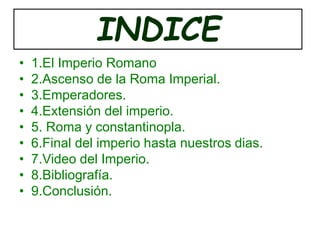El documento describe la historia del Imperio Romano. Explica que después de la muerte de Julio César, el poder en Roma se dividió entre Octavio, Marco Antonio y Lépido. Más tarde, el imperio estuvo gobernado por una serie de emperadores con poder absoluto bajo un sistema conocido como Principado. El imperio se extendió para abarcar grandes territorios en Europa, Asia y África.