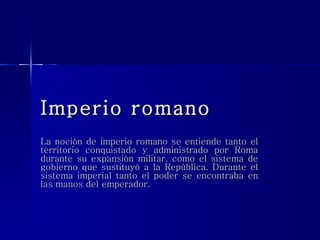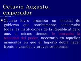 El documento describe el surgimiento y evolución del Imperio Romano desde su fundación por Octavio Augusto hasta su caída. Augusto estableció un sistema de gobierno conocido como Principado que concentraba el poder en la figura del emperador. El Imperio alcanzó su máxima expansión territorial bajo Trajano y experimentó periodos de paz y prosperidad bajo dinastías como los Julio-Claudios. Diocleciano reorganizó el Imperio dividiéndolo en dos mitades gobernadas por emperadores y césares.