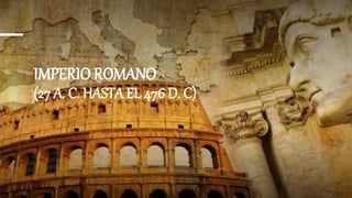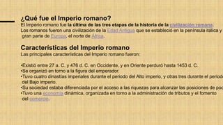 El Imperio romano fue la última etapa de la civilización romana, que existió entre 27 a.C. y 476 d.C. en Occidente y hasta 1453 d.C. en Oriente. Se organizó en torno a la figura del emperador y tuvo cuatro dinastías imperiales durante el Alto Imperio y tres durante el Bajo Imperio. Tuvo una economía dinámica basada en la administración de tributos y el comercio.