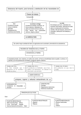 El Imperio incaico existió entre los siglos XII y XV, logrando un asombroso desarrollo en América a través de su organización política, social y económica. El inca era la máxima autoridad y estaba a cargo del gobierno imperial. La sociedad estaba estratificada en el inca, la nobleza y el pueblo. La economía se basaba en la agricultura colectiva y el trueque, con cultivos como la papa y el maíz. La religión era politeísta y rindió culto al dios Sol Inti.