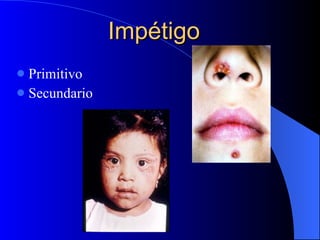 El documento proporciona información sobre varias enfermedades dermatológicas como el impétigo, prurigo actínico y lupus eritematoso. Describe las características clínicas, epidemiología, diagnóstico diferencial y tratamiento de cada una. También ofrece detalles sobre los criterios y manifestaciones del lupus eritematoso sistémico, así como factores de riesgo, pruebas de laboratorio e implicaciones durante el embarazo.