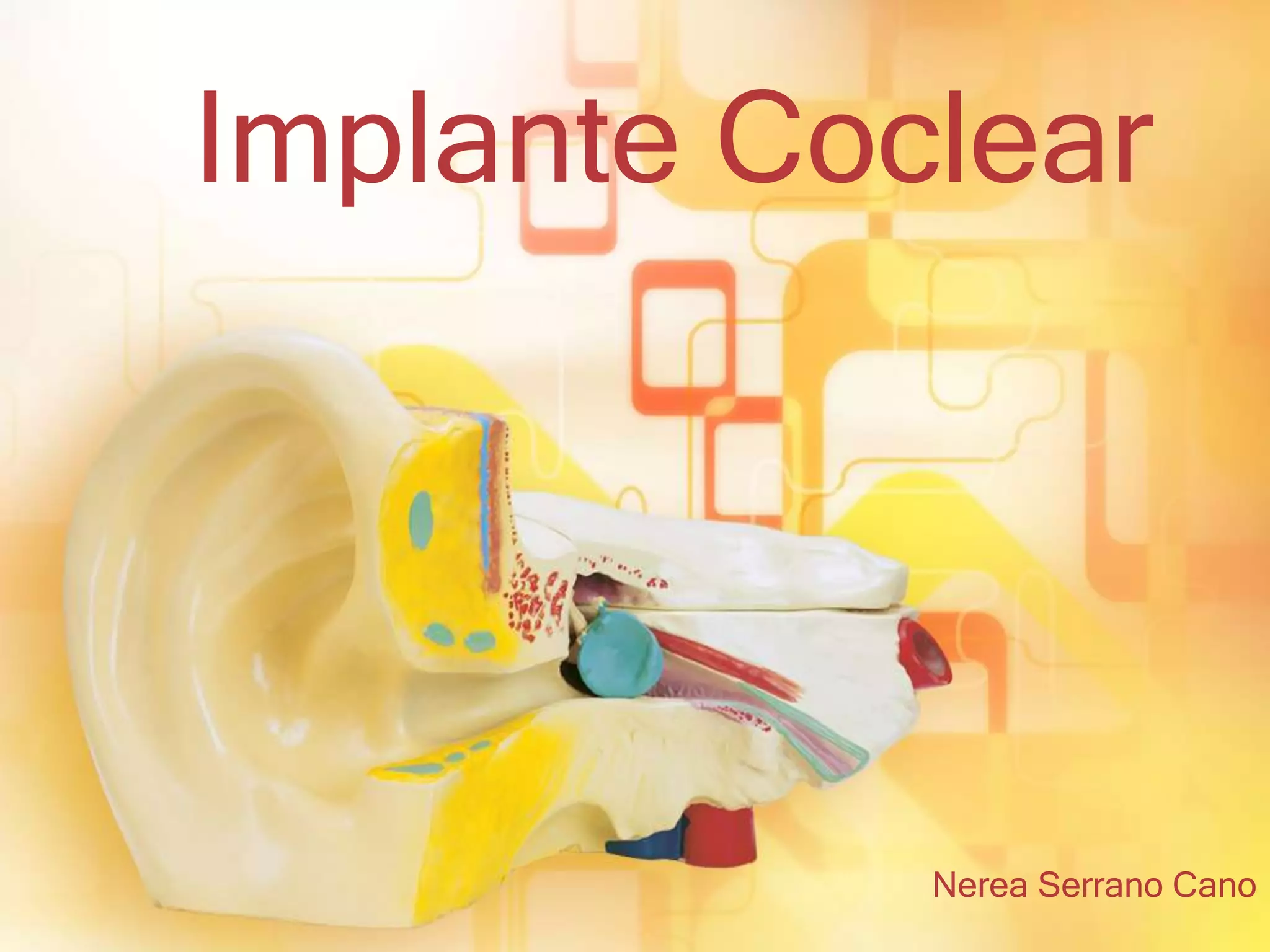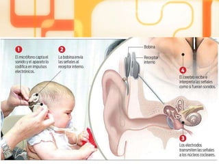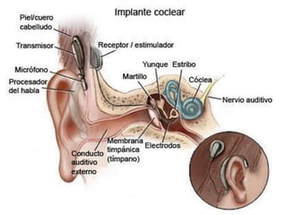 Un implante coclear es un dispositivo electrónico que se implanta quirúrgicamente para proporcionar audición a personas sordas. Consta de componentes internos que se implantan detrás de la oreja y estimulan el nervio auditivo, y componentes externos como un procesador de sonido. El proceso implica una cirugía, rehabilitación con entrenamiento auditivo, y un equipo interdisciplinario apoya al paciente.