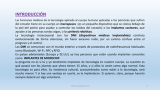 El documento explora el uso de tecnología médica, específicamente implantes de microchips en humanos, que permiten el control de información personal y mejora de funciones corporales. Aunque estos implantes ofrecen beneficios, existe un creciente temor sobre la privacidad y el control potencial por parte de gobiernos y empresas. La discusión se centra en cómo la aceptación de esta tecnología podría variar entre generaciones, especialmente entre los jóvenes que están más acostumbrados a la tecnología.