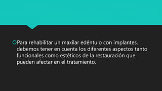 El documento discute los factores que deben considerarse para determinar el número de implantes dentales necesarios para una restauración, incluyendo la morfología ósea, la cantidad de hueso, la clase esquelética y la presencia de parafunciones. Generalmente se requieren entre 4-8 implantes para una prótesis fija en el maxilar superior y entre 4-6 para una prótesis removible, mientras que para la mandíbula los rangos son de 4-8 implantes y 2-4 implantes respectivamente.