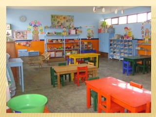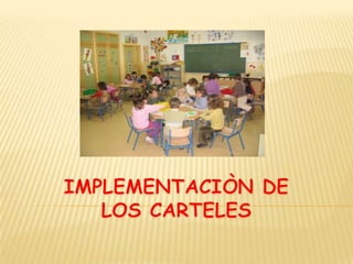 El documento describe la implementación de carteles en un aula para controlar la asistencia, saludar, marcar el calendario, indicar la responsabilidad diaria de los estudiantes, celebrar cumpleaños y establecer normas de convivencia. Los carteles se usan de manera lúdica a través de canciones y actividades para involucrar a los estudiantes.