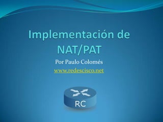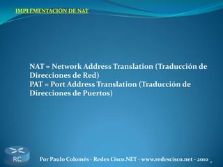 El documento analiza la traducción de direcciones de red (NAT) y sus diversas implementaciones, incluyendo NAT dinámico, estático y con sobrecarga (PAT). Se discuten las direcciones IP públicas y privadas, así como los métodos de configuración y ventajas y desventajas de cada tipo de NAT. Además, se detallan comandos útiles para manejar NAT en dispositivos de red.
