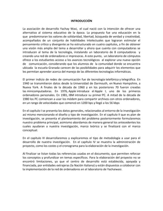La asociación Yachay Wasi desea implementar una red de computadoras en su laboratorio para mejorar la educación. Actualmente no cuentan con una red ni personal capacitado para administrarla. El documento propone diseñar e instalar una red de 8 computadoras para compartir archivos e internet, y capacitar a alguien en su mantenimiento. Esto mejoraría la enseñanza de informática y el acceso a la tecnología para los estudiantes de una comunidad con pocos recursos.