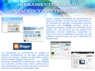 Las herramientas de mantenimiento de blogs permiten administrar un blog de forma gratuita y sin conocimientos técnicos. Se clasifican en aquellas que ofrecen alojamiento gratuito y en software que se instala en un servidor propio para controlar totalmente la funcionalidad del blog. Los blogs incluyen características como comentarios, enlaces, fotografías y formatos para su redifusión.
