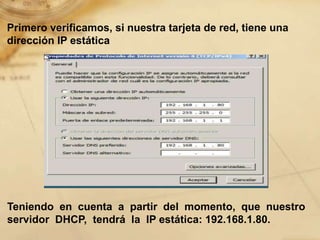 El documento describe los pasos para configurar un servidor DHCP en un servidor con una dirección IP estática 192.168.1.80, incluyendo agregar la función DHCP, establecer el dominio y servidor DNS, configurar un ámbito DHCP, e instalar el servicio DHCP. Finalmente, se prueba desde un cliente obteniendo con éxito una dirección IP asignada por el servidor DHCP recién configurado.