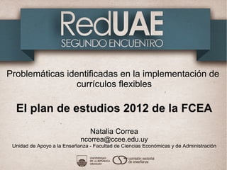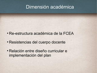 Este documento identifica varios desafíos en la implementación de currículos flexibles en la Facultad de Ciencias Económicas y de Administración (FCEA). Entre los principales problemas se encuentran las resistencias del cuerpo docente al cambio académico, la necesidad de mejorar la coordinación entre carreras y la orientación a los estudiantes, y el desfasaje entre el diseño curricular y su implementación real. El documento también describe diversas herramientas y recursos desarrollados para apoyar a los estudiantes en su transición a los