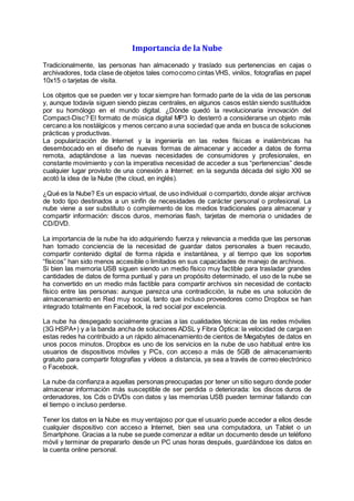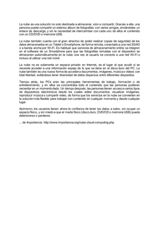 El documento describe la importancia de la nube como una solución para almacenar y compartir datos de forma remota desde cualquier dispositivo con acceso a Internet. La nube permite a los usuarios acceder a sus archivos desde cualquier lugar y compartir contenido fácilmente sin necesidad de medios físicos. Además, almacenar datos en la nube los protege de la pérdida o deterioro y permite realizar copias de seguridad de forma automática. Gracias a su accesibilidad desde múltiples dispositivos y su capacidad de compartir archivos,