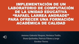 El documento describe los requisitos para implementar un laboratorio de computación en una unidad educativa, incluyendo un sitio adecuado, instalación eléctrica segura, equipos de red, computadoras, software y personal capacitado. Explica los pasos para instalar la energía eléctrica, conectar la red y el internet, y asegurar que el laboratorio cumpla con normas de seguridad y calidad.