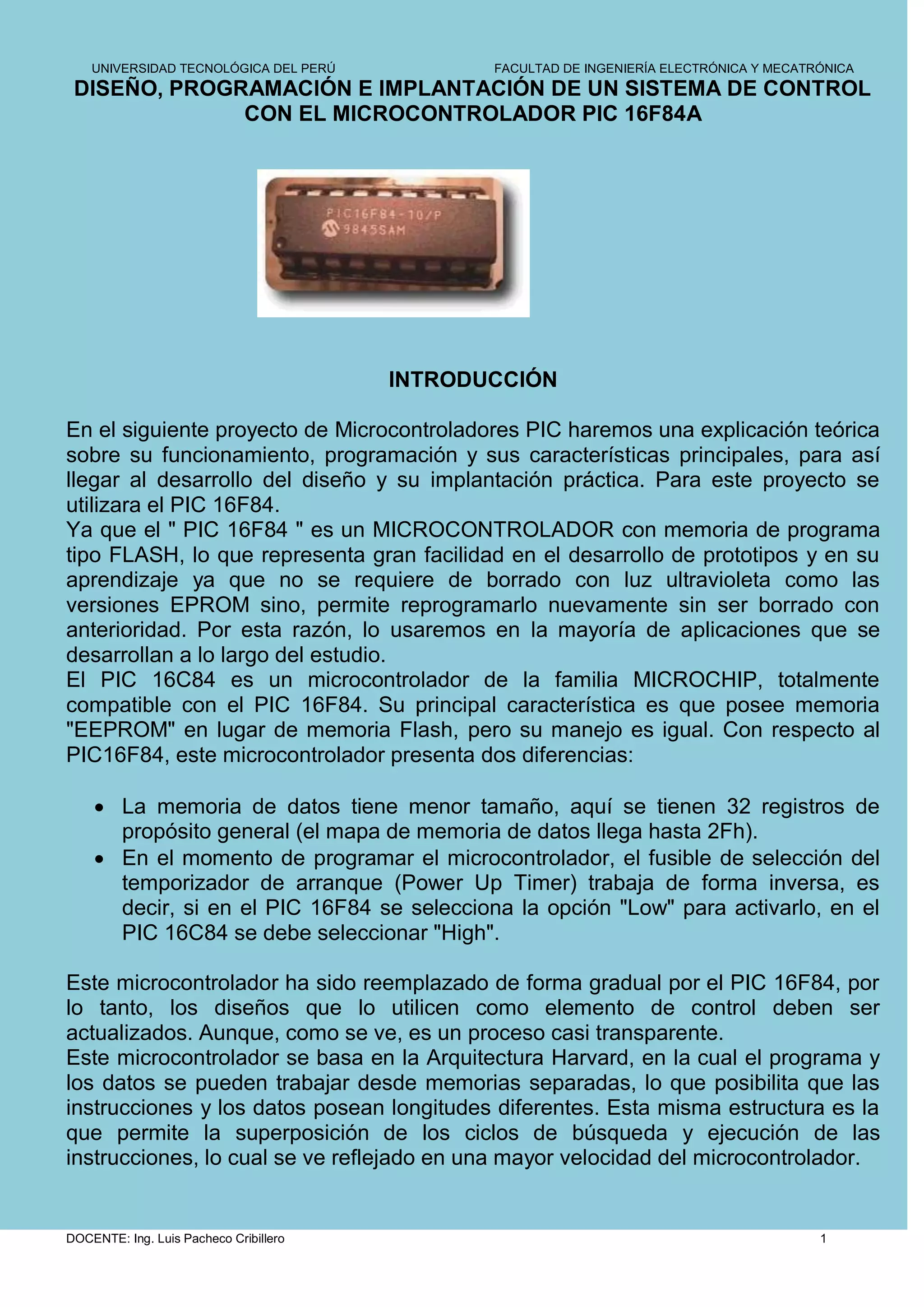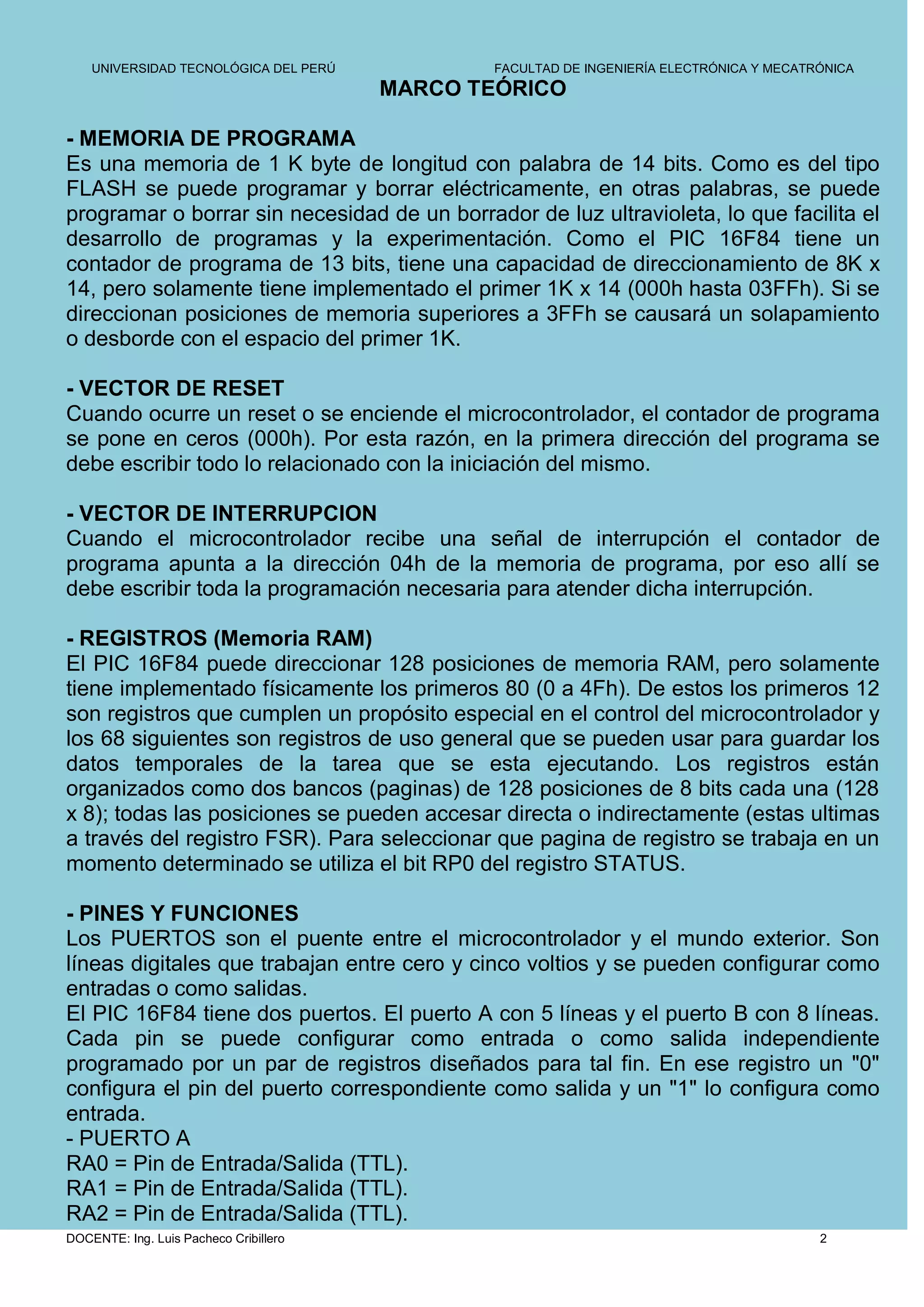 Este documento presenta una introducción al microcontrolador PIC 16F84A. Explica que es un microcontrolador con memoria flash que permite reprogramarlo fácilmente. Luego describe las características de la memoria de programa, registros, puertos y pines del PIC 16F84A, así como su oscilador externo. Finalmente, proporciona un marco teórico más detallado sobre estos componentes y funciones del microcontrolador.