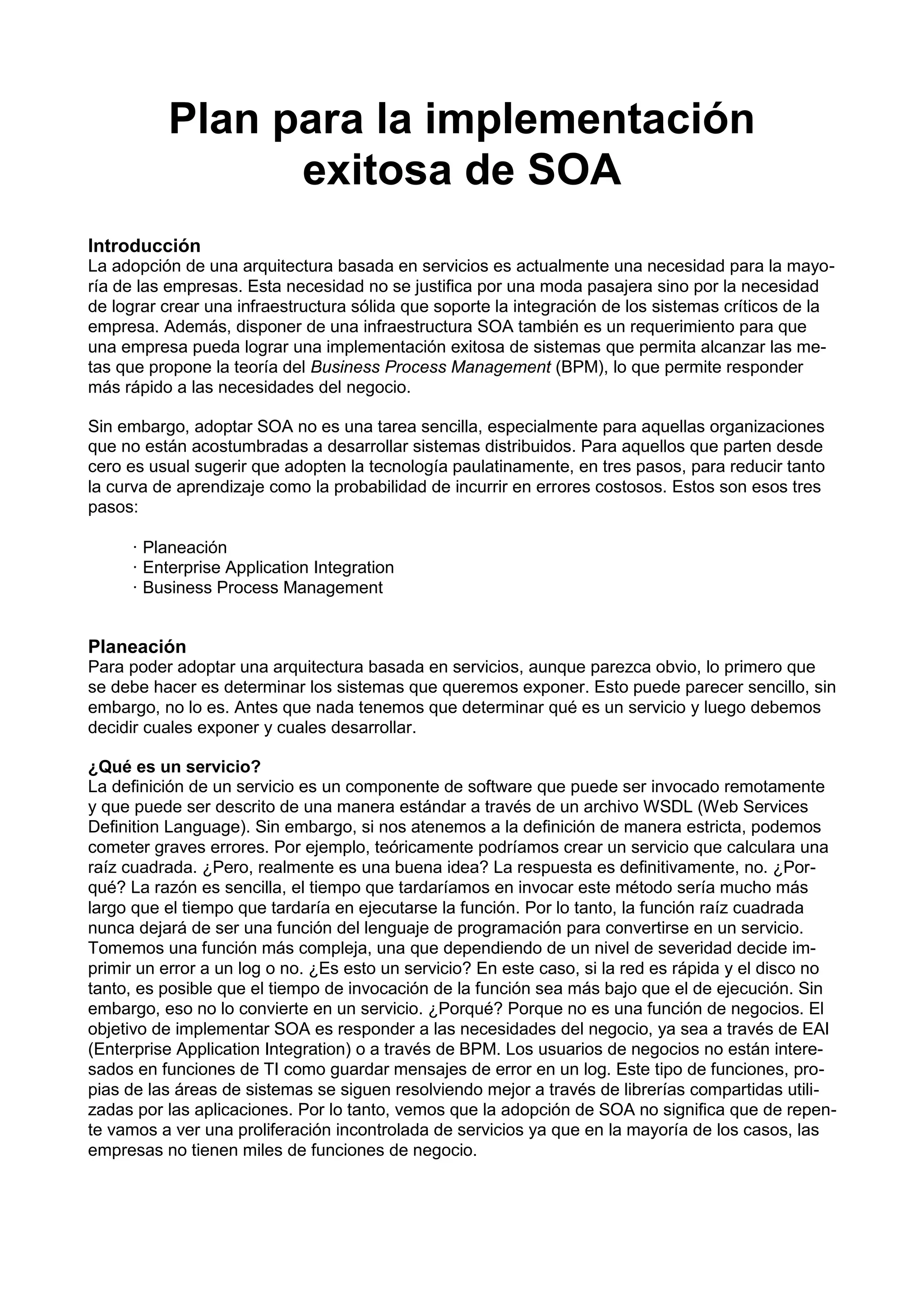 Este documento presenta un plan para la implementación exitosa de una arquitectura basada en servicios (SOA). El plan consta de tres pasos: 1) planeación, que incluye identificar los sistemas a exponer como servicios y determinar qué constituye un servicio; 2) integración de aplicaciones empresariales; y 3) gestión de procesos empresariales. También describe consideraciones clave como los protocolos de transporte a utilizar y la gobernanza de servicios.