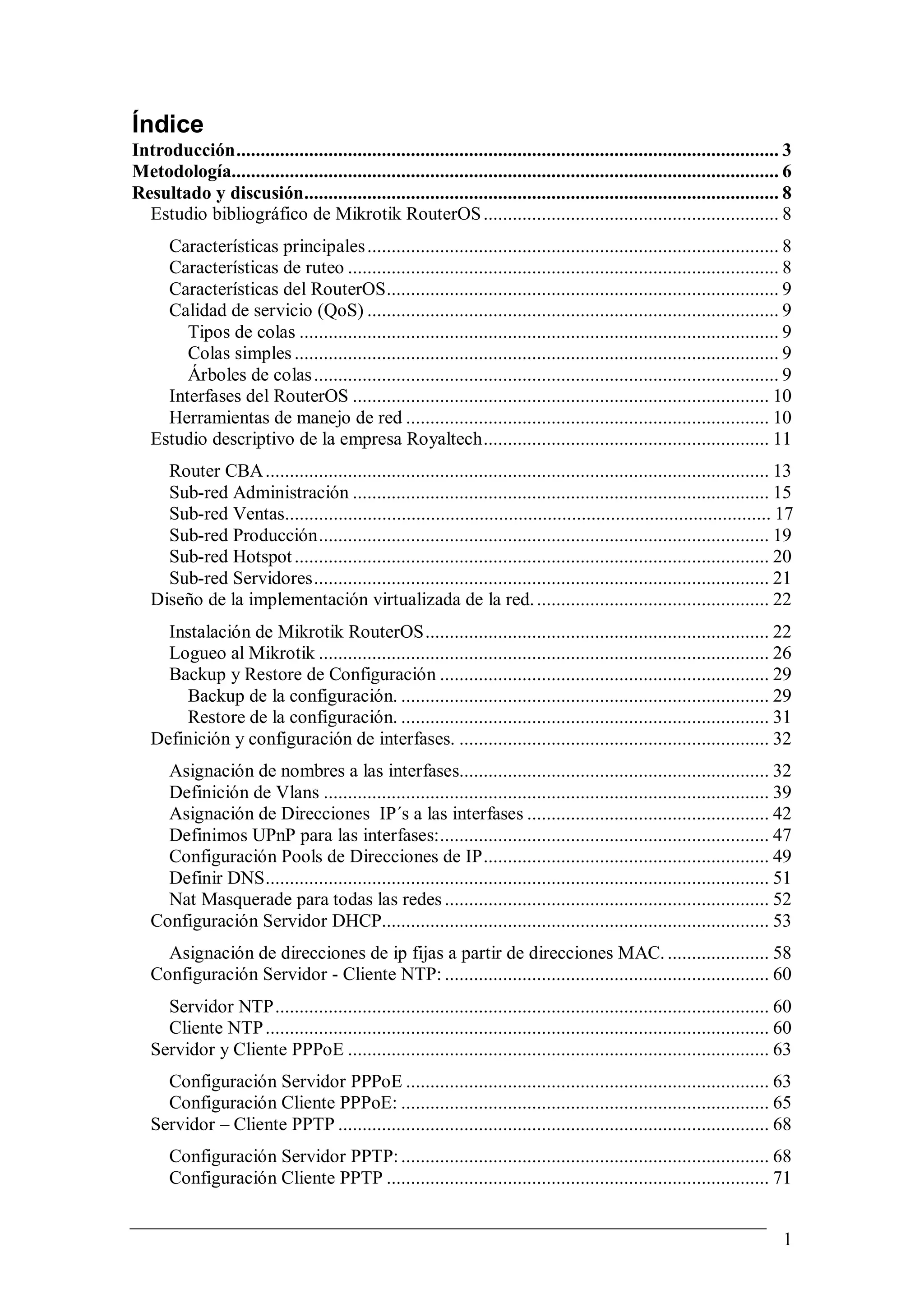 Este documento describe la configuración de una red virtualizada utilizando Mikrotik RouterOS. Incluye la instalación de RouterOS, la definición de interfaces de red, subredes, servicios DHCP, firewall, proxy web, balanceo de carga, control de ancho de banda y más. El objetivo es implementar una red que emule la estructura de la empresa Royaltech con diferentes segmentos de red para administración, ventas, producción y otros.