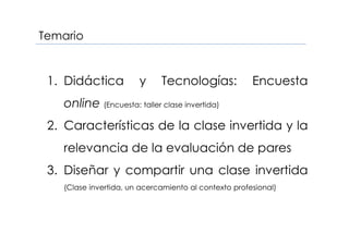 El documento presenta la metodología de la clase invertida como una alternativa pedagógica que permite a los estudiantes aprender a través de un repositorio digital en casa y resolver dudas de manera colaborativa en el aula. Se discuten sus características, beneficios y la relevancia de herramientas tecnológicas para facilitar el aprendizaje. Además, se enfatiza en el rol del profesor como facilitador y la importancia de la evaluación y la interacción en el proceso de enseñanza-aprendizaje.