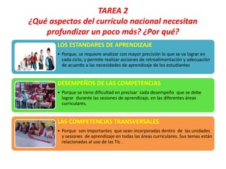 El documento discute varios aspectos del currículo nacional que necesitan profundizarse más, incluyendo los estándares de aprendizaje, los desempeños de las competencias, las competencias transversales, la evaluación formativa y sus instrumentos, y las orientaciones pedagógicas para el área de ciencia y ambiente. También propone iniciar la implementación de los desempeños de las competencias, la diversificación curricular, y la evaluación formativa.