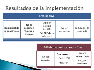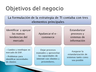 TI es una empresa estadounidense fundada en 1930 que se dedica al desarrollo de semiconductores y circuitos integrados. En la década de 1950 ingresó al negocio de los transistores y en 1958 desarrolló el primer circuito integrado. Actualmente se compone de dos divisiones principales: Semiconductores y Soluciones para Educación y Productividad. En 2006 implementó un sistema ERP de SAP a nivel global para estandarizar procesos.