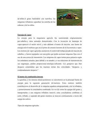 El documento describe la evolución de la maquinaria agrícola a lo largo del siglo XX, especialmente con la aparición del tractor, lo que permitió realizar tareas agrícolas de forma más rápida y a gran escala. También explica cómo la mecanización agrícola ha aumentado enormemente la productividad, permitiendo que un solo granjero alimente a 130 personas hoy en día. Finalmente, detalla los diferentes tipos de maquinaria, equipos e implementos agrícolas utilizados en la agricultura moderna.