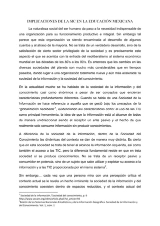 El documento analiza las implicaciones de la Sociedad de la Información y el Conocimiento (SIC) en la educación mexicana. Explica que coexisten una sociedad de la información basada en el consumo pasivo de datos, y una sociedad del conocimiento donde se produce información. También describe la brecha digital en México que excluye a los sectores pobres del acceso a las tecnologías. Finalmente, argumenta que la educación debe enseñar el uso productivo de las tecnologías para reducir esta brecha y promover un desarrollo integral.