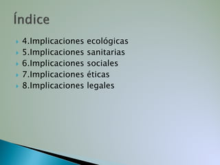 Este documento resume las posibles implicaciones ecológicas, sanitarias, sociales, éticas y legales de la biotecnología. Señala que la introducción de organismos transgénicos podría provocar la extinción de especies naturales y la pérdida de diversidad genética. También podría dar lugar a nuevas enfermedades y contaminaciones. Además, plantea preocupaciones sobre el uso de la información genética personal y la posible manipulación del genoma humano, así como sobre la patentabilidad de organismos y genes.