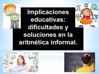 El documento habla sobre las dificultades y soluciones en la aritmética informal en la educación preescolar. Propone que antes de enseñar la adición y sustracción mental de una unidad, los estudiantes deben dominar el concepto de número siguiente y número anterior, y descubrir reglas generales sobre cómo cambia un número al agregar o quitar una unidad.