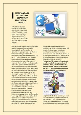 Las TICs son herramientas importantes para el desarrollo profesional docente y el aprendizaje de los estudiantes en el siglo XXI. Permiten nuevas estrategias de enseñanza creativas y divertidas, y facilitan un ambiente de aprendizaje adaptativo. Los docentes ya no son solo los gestores del conocimiento, sino guías que permiten a los estudiantes aprender de forma autónoma. La incorporación de las TICs en la educación tiene la función de ser un medio de comunicación y canal de intercambio de conocimientos y experiencias.