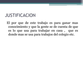 El documento describe la importancia de los computadores y cómo se usan en el hogar y en las empresas. Explica que los computadores son útiles para completar tareas escolares y trabajo y que sitios como SlideShare y YouTube ofrecen tutoriales para aprender a usar programas comunes como Microsoft PowerPoint, Word y Publisher. El objetivo es crear conciencia sobre cómo los computadores facilitan el trabajo y la búsqueda de información.