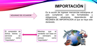 Este documento describe los diferentes regímenes de importación en Ecuador, incluyendo importación para el consumo, admisión temporal para reexportación, admisión temporal para perfeccionamiento activo, y depósitos aduaneros. También explica los pasos para obtener el registro de importador, los tributos que se pagan por productos importados como aranceles ad-valorem e IVA, y las características de los importadores.