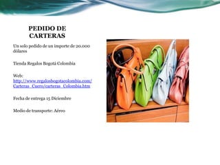 Un pedido de carteras de cuero de Colombia por $20,000 dólares será entregado el 15 de diciembre por transporte aéreo. Los términos de entrega pueden ser EXW, FCA, CPT, CIP o DDP, donde el vendedor asume más responsabilidades y costos con cada término. Se debe investigar los costos de importación y aranceles para determinar la rentabilidad.