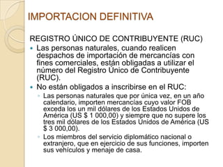 La importación definitiva permite el ingreso legal de mercancías del exterior para su consumo en el país. Las personas naturales que importen mercancías con fines comerciales deben utilizar un Registro Único de Contribuyente. El proceso incluye la transmisión electrónica de datos, el pago de impuestos, y la asignación del despacho a un canal verde, naranja o rojo que determina los controles aplicables antes de retirar las mercancías.
