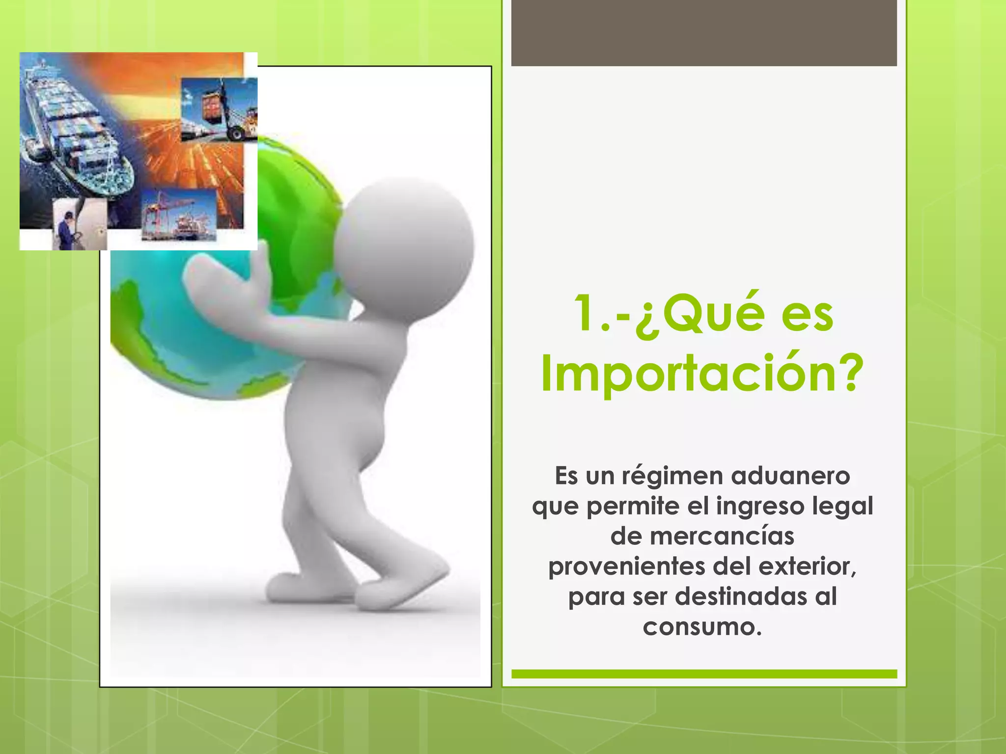 Este documento proporciona información sobre el proceso de importación en Perú. Explica que la importación permite el ingreso legal de mercancías del exterior para su consumo interno y está sujeta a aranceles y otros impuestos. También describe los documentos requeridos como la factura comercial, documentos de transporte y declaración única de aduanas, así como los canales de revisión y los plazos para el despacho de mercancías.