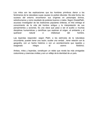 Los mitos son las explicaciones que los hombres primitivos dieron a los fenómenos naturales cuyas causas no podían entender. Según el investigador Oreste Plath, los mitos y leyendas chilenos revelan el conocimiento del hombre antiguo y reflejan la identidad de un país, al explicar eventos naturales y preservar costumbres y creencias a través de historias repetidas y exageradas.