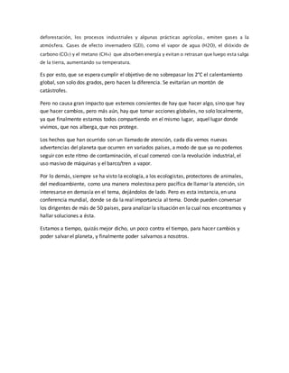 La COP21 se celebrará en París en 2015 para negociar un acuerdo internacional sobre el cambio climático y mantener el calentamiento global por debajo de 2°C. El aumento de temperaturas ha causado desastres naturales como inundaciones, sequías y deshielo acelerado. Las actividades humanas como la quema de combustibles fósiles y la deforestación emiten gases de efecto invernadero que atrapan el calor en la atmósfera. Es necesaria una acción global urgente para reducir las emisiones y evitar consecuencias cata