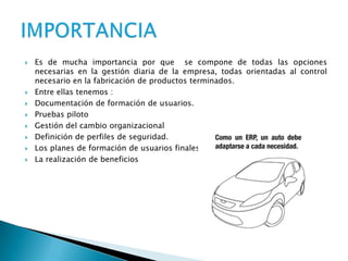 El documento describe las ventajas de utilizar un sistema ERP para la gestión de una empresa. Menciona que un ERP proporciona las herramientas necesarias para controlar la fabricación de productos terminados a través de la documentación, pruebas piloto, gestión del cambio, definición de perfiles de seguridad y planes de formación. También señala que un ERP con capacidad de gestión de proyectos puede especializar los procesos empresariales y reducir costos, y que elegir un sistema ERP escalable permite que la empresa crezca j