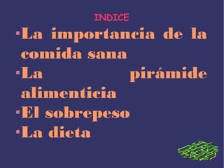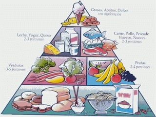 Este documento explica la importancia de una buena alimentación para la salud. Resalta que comer una variedad de alimentos protege contra enfermedades, y presenta la pirámide alimenticia como guía para una dieta equilibrada. También discute sobre el sobrepeso y cómo una dieta equilibrada mantiene un peso saludable.