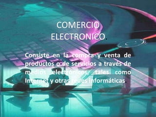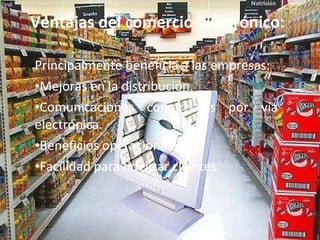 El comercio electrónico consiste en la compra y venta de productos o servicios a través de Internet u otras redes, lo que beneficia principalmente a las empresas mediante mejoras en la distribución, comunicaciones comerciales electrónicas y ventajas operacionales. Existen tres formas principales de hacer negocios por Internet: negocio a cliente, donde empresas grandes y pequeñas venden productos directamente al público; negocio a negocio, para transacciones entre distribuidores y proveedores; y cliente a cliente, donde los clientes realizan operaciones comercial