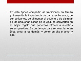 El documento describe la importancia de celebrar la Navidad en familia y transmitir valores como el amor, la solidaridad y el espíritu de dar a los demás. Compartir tradiciones y enseñar a los hijos que la felicidad no proviene de regalos materiales, sino de disfrutar juntos y con espiritualidad. La Navidad es una oportunidad para fortalecer lazos a través de la reflexión, la oración y el compartir historias familiares.
