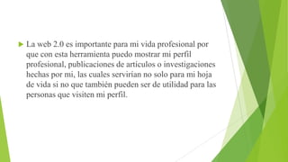 La web 2.0 es importante para la vida profesional y la educación porque permite mostrar el perfil y trabajo de una persona, así como interactuar y compartir información de manera virtual sin importar la ubicación. Tener un blog u otra página permite darse a conocer y mejorar las oportunidades laborales. Los derechos de autor protegen las creaciones intelectuales de sus autores.