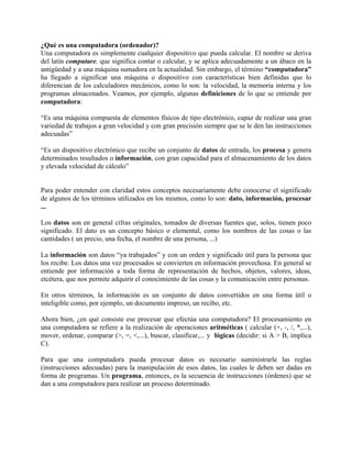 Este documento proporciona una breve introducción a los conceptos básicos de computación e informática. Define computadora como un dispositivo electrónico que procesa datos siguiendo instrucciones de programas para generar información. Explica que los datos se convierten en información útil una vez procesados y que los programas son secuencias de instrucciones dadas a la computadora. Además, distingue entre hardware, software y personal informático como los tres pilares de un sistema informático.