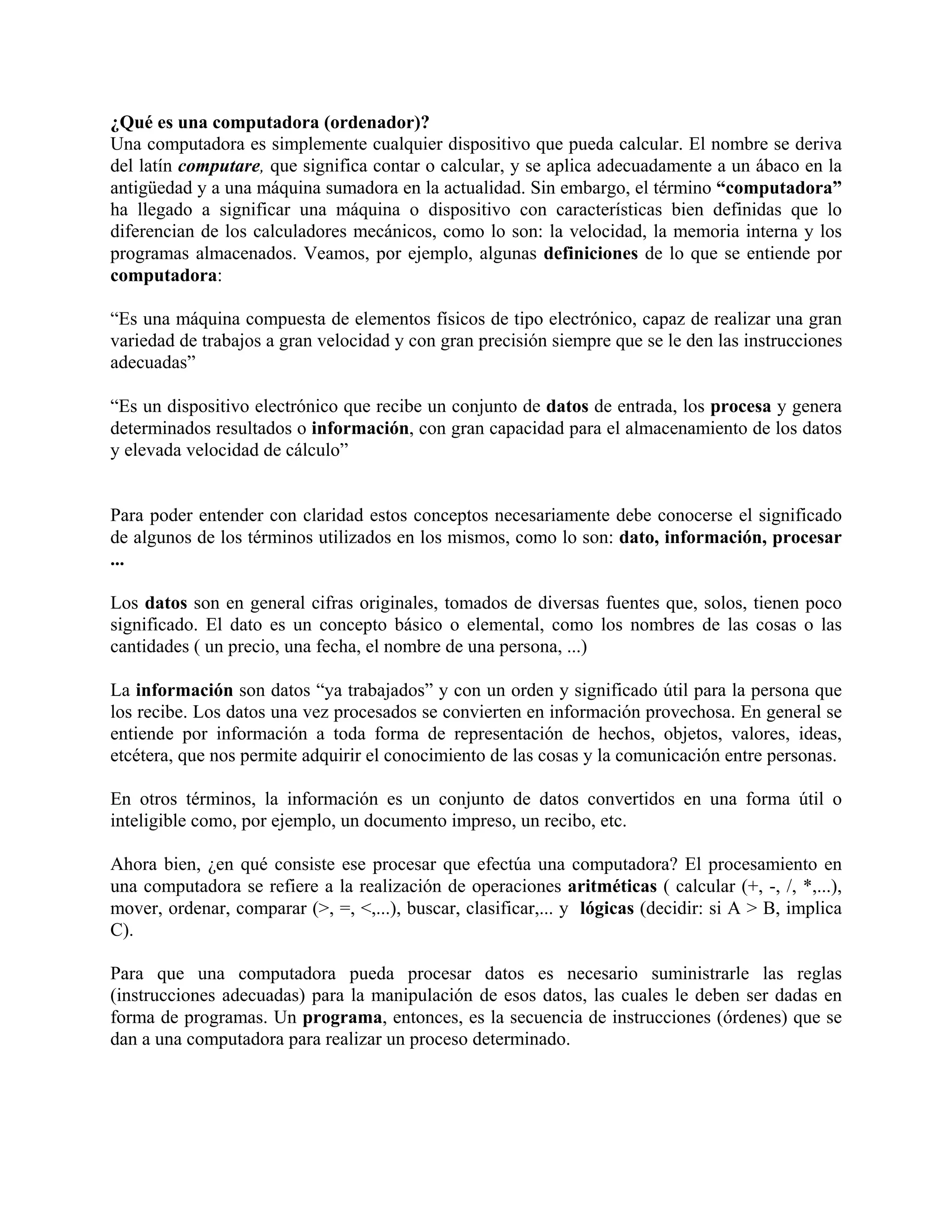 Este documento proporciona una breve introducción a los conceptos básicos de computación e informática. Define computadora como un dispositivo electrónico que procesa datos siguiendo instrucciones de programas para generar información. Explica que los datos se convierten en información útil una vez procesados y que los programas son secuencias de instrucciones dadas a la computadora. Además, distingue entre hardware, software y personal informático como los tres pilares de un sistema informático.