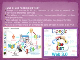 Las herramientas web permiten mejorar la interacción en internet al convertir la red en una base de datos accesible desde diferentes aplicaciones. Las herramientas web 3.0 se usan como apoyo para la educación a distancia mediante entornos que simulan aulas y laboratorios virtuales, permitiendo el intercambio de documentos y la colaboración en grupos de trabajo. Estas herramientas también ayudan a crear nuevos modelos de aprendizaje en la educación inicial a través de gráficos interactivos 3D, juegos educativos y