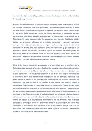 Este documento describe la importancia de enseñar y aprender matemáticas en la educación básica. Explica que las matemáticas son necesarias para interactuar en el mundo moderno y brindan oportunidades para el futuro de los estudiantes. También propone actualizar el currículo de matemáticas para enfocarse más en la resolución de problemas y desarrollar habilidades prácticas. El documento concluye explicando que el objetivo principal del área de matemáticas es interpretar y resolver problemas de la vida diaria.