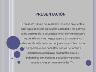 El documento discute la importancia de las tecnologías de la información y la comunicación (TIC) en la educación. Los estudiantes ya dominan estas herramientas de forma natural, por lo que necesitan orientación de los docentes y padres para evitar riesgos online. Un buen uso de las TIC en la educación puede ayudar a los estudiantes a desenvolverse mejor en el mundo moderno al encontrar y organizar información con facilidad.