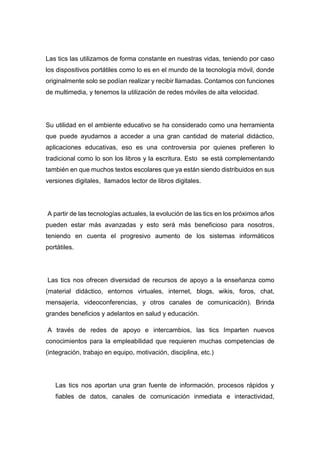 Las Tecnologías de la Información y Comunicación (TICs) han cobrado gran importancia en la educación y la vida cotidiana. Permiten el acceso a materiales educativos digitales y programas de educación en línea que facilitan el estudio sin horarios fijos. Cada día las TICs mejoran y se vuelven más esenciales, ya que proporcionan acceso a Internet desde dispositivos móviles y redes sociales que conectan a las personas. Aunque algunos prefieren los métodos tradicionales, las TICs ofrec