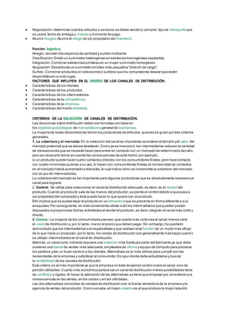 El documento describe la importancia de los canales de distribución para llevar los productos de los fabricantes a los consumidores finales de manera eficiente. Explica que los intermediarios cumplen un papel clave en este proceso al facilitar que los productos lleguen a los usuarios finales a precios razonables. También señala que la elección de canales de distribución adecuados mejora la eficiencia de las ventas.