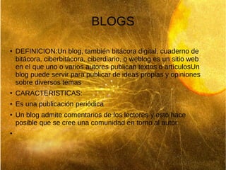 Este documento define un blog como un sitio web en el que uno o más autores publican textos o artículos sobre diversos temas. Explica que un blog permite comentarios de lectores, lo que crea una comunidad en torno al autor. Además, describe diferentes tipos de blogs como personales, de negocios o educativos, y explica cómo los blogs pueden usarse para estimular a los estudiantes a escribir, intercambiar ideas y trabajar en equipo.