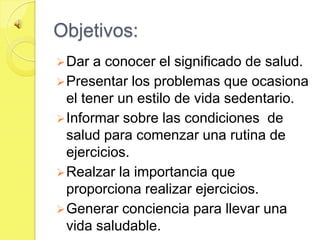 El documento describe la importancia del ejercicio para la salud. Explica que la salud incluye el bienestar físico, mental y social. Un estilo de vida sedentario puede causar problemas de salud, mientras que el ejercicio regular mejora la salud. Recomienda que las personas interesadas en mejorar su condición física consulten primero a un experto en salud y luego a un nutricionista para comenzar una rutina de ejercicios segura y efectiva.