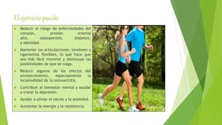El documento describe los beneficios del ejercicio para la salud, incluyendo la reducción del riesgo de enfermedades cardíacas, diabetes y obesidad, así como el mantenimiento de la flexibilidad de las articulaciones. Recomienda hacer ejercicio de moderada a vigorosa intensidad de 5 a 30 minutos al día de 5 a 7 días a la semana para obtener los mayores beneficios, empezando gradualmente para evitar lesiones.